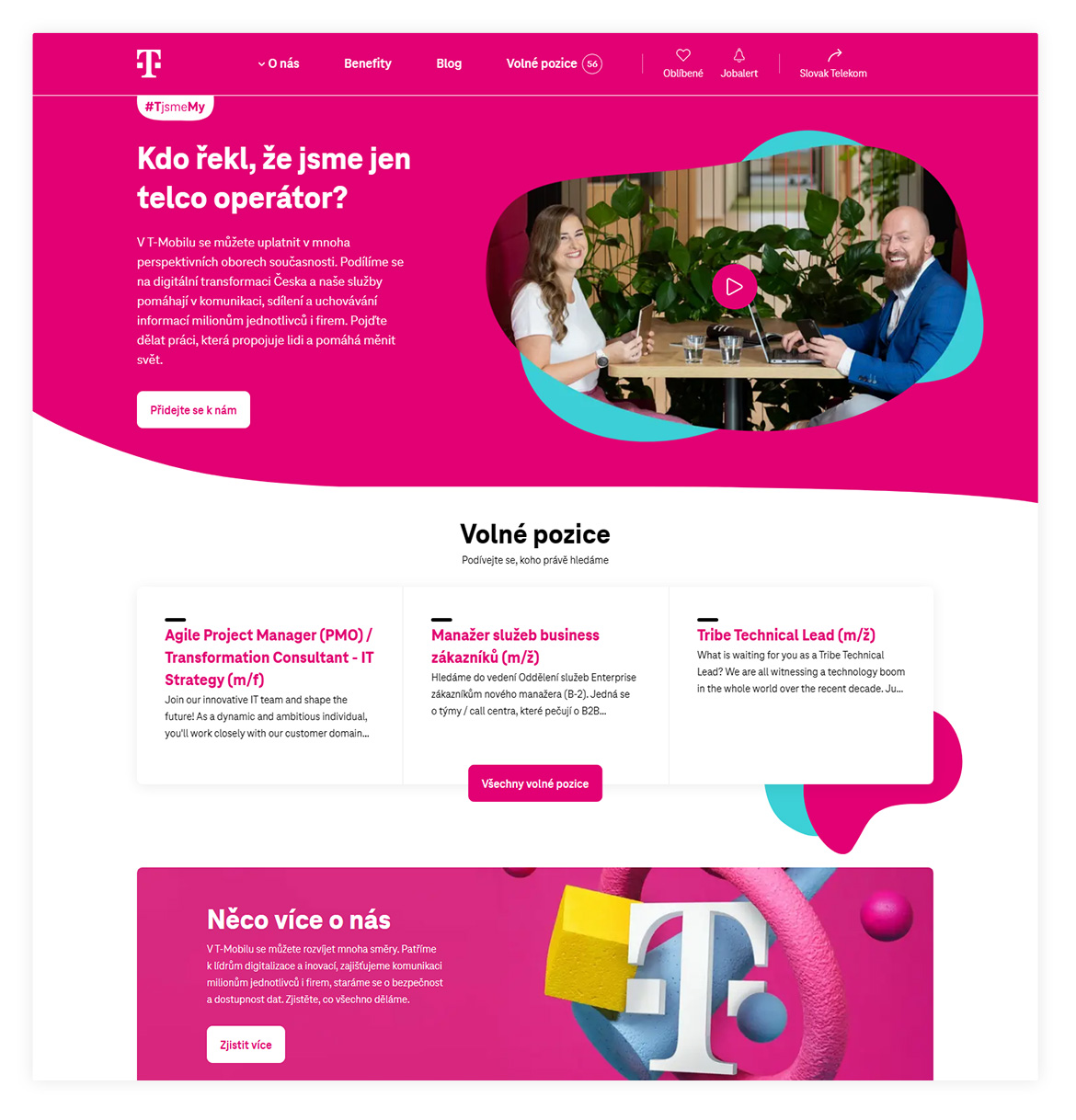 Na stránkách nechybí firemní vize, blogová sekce s detailním popisem jednotlivých pozic a zajímavosti z T-Mobilu a Slovak Telekomu.