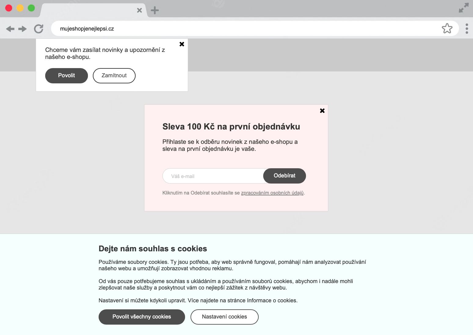Toto je běžné u mnoha e-shopů. Jak na vás takový e-shop působí? Omezte vyskakovací okna na minimum a promyslete jejich načasování.