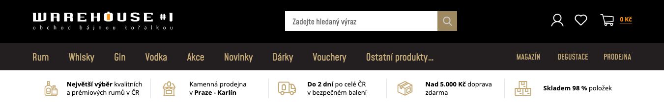 Na Warehouse1.cz jsme umístili tzv. USP proužek hned pod hlavní navigaci, takže jsou konkurenční výhody viditelné na každé stránce e-shopu.