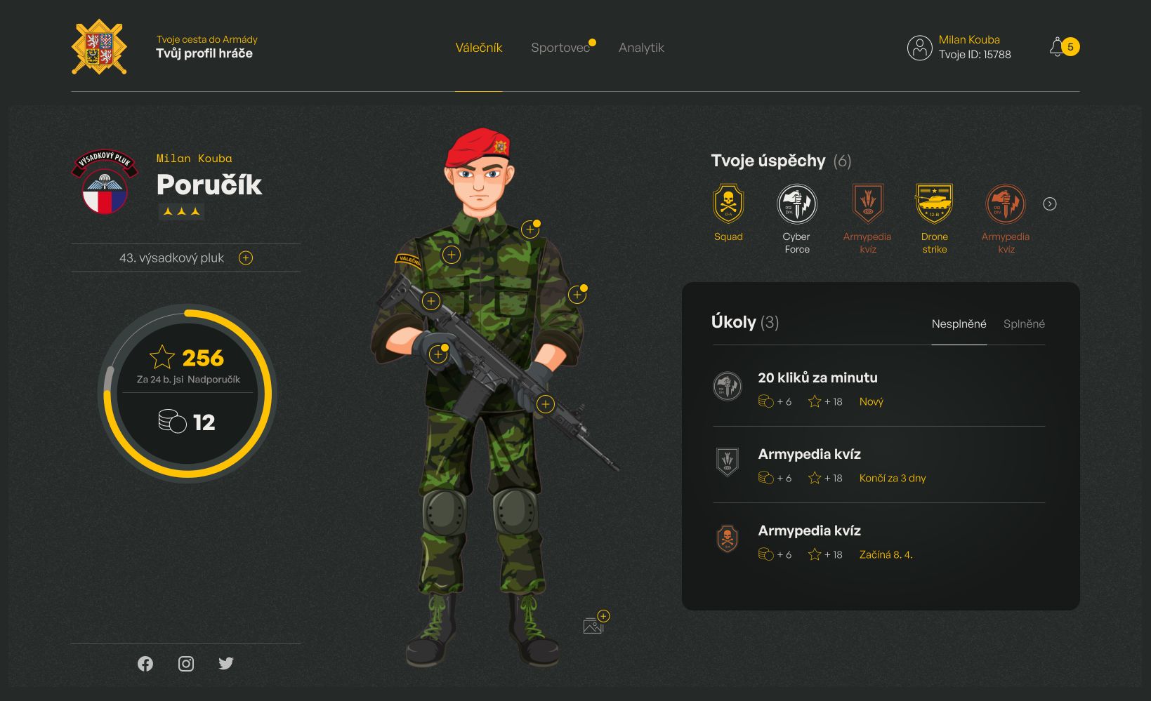 Jak víme, praxe nám teprve ukáže, jak jsme na tom. I proto jsme v rámci portálu vytvořili herní zónu, kde si hráč dle splnění jednotlivých úkolů může personalizovat jednoho ze tří avatarů – virtuální profil vojáka. Průběžně plní nejen fyzické úkoly v reálném světě, ale hraje hry, sbírá body a neustále se zdokonaluje. Každý si tak může dopředu otestovat sám sebe, zda na práci v armádě skutečně má.