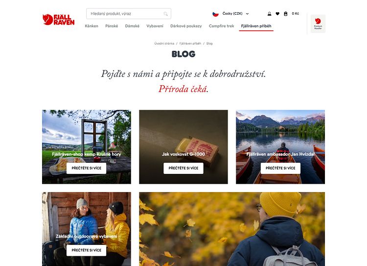 Naše zkušenosti z e‑commerce projektů potvrzují, že redakční část je mimořádně důležitou součástí internetového obchodu. Zvyšuje zákaznickou loajalitu, posiluje značku a napomáhá SEO. Proto jsme blog integrovali i do nově vznikajícího e‑shopu. Články jsou nejen nadčasové (vznik značky Fjällräven, materiály a péče o ně, udržitelnost a životní prostředí), ale také reagují na aktuální potřeby firmy. Komunikují třeba sezónní kolekce nebo probíhající soutěže.